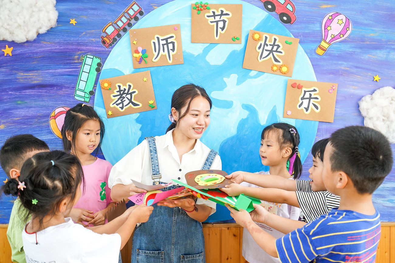 2020年9月9日,浙江省湖州市长兴县太湖街道中心幼儿园内,孩子将使用废旧材料制作的“贺卡”送给老师。