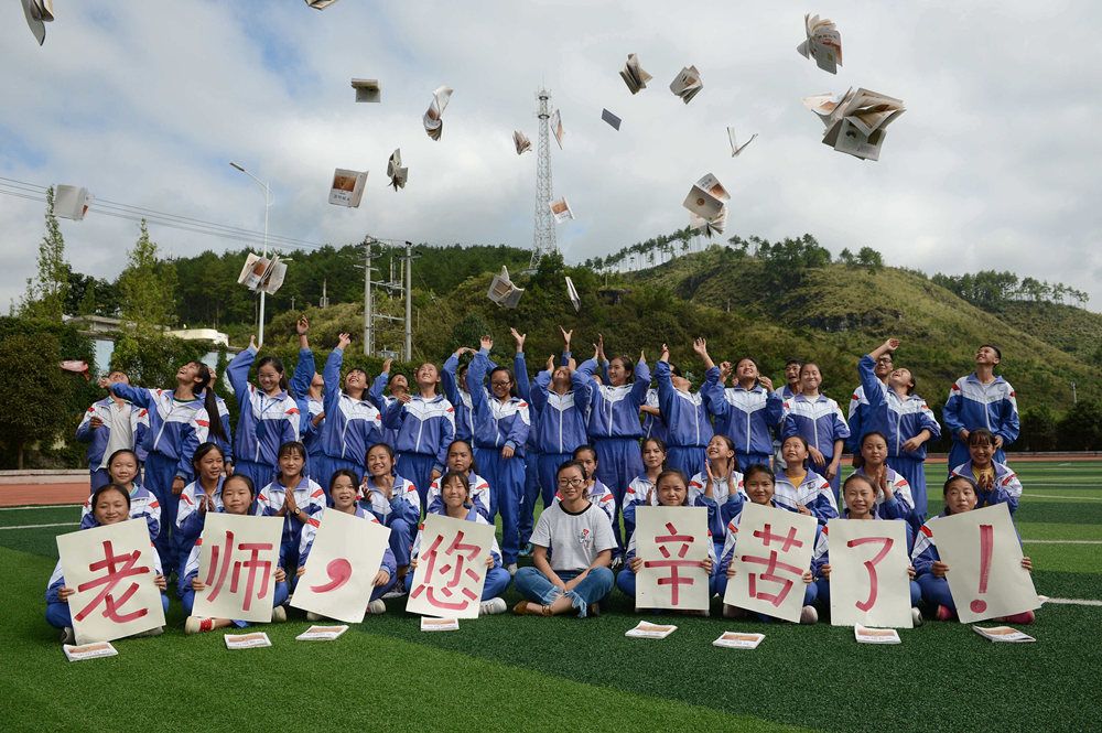 2018年9月4日,在贵州省黔南龙里县湾滩河镇羊场中学,王丹(中)的学生在操场上以特别的方式提前祝她教师节快乐。