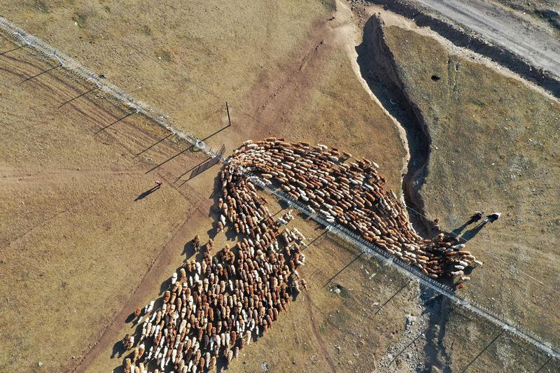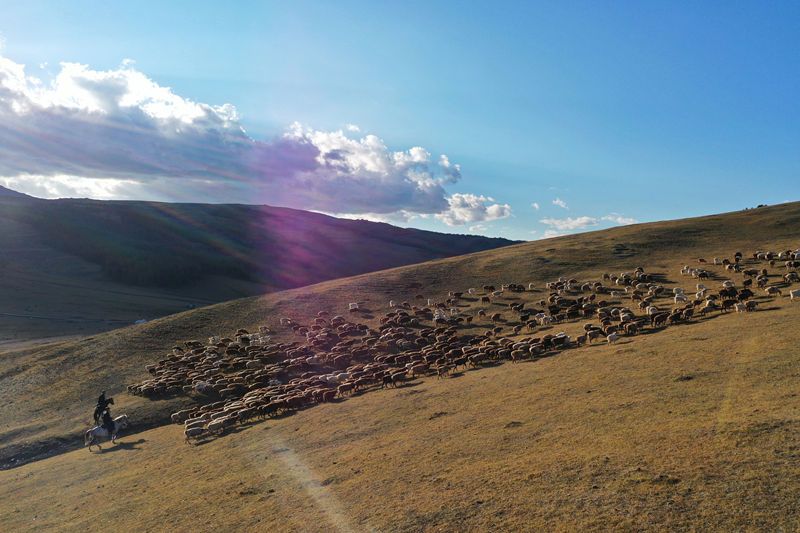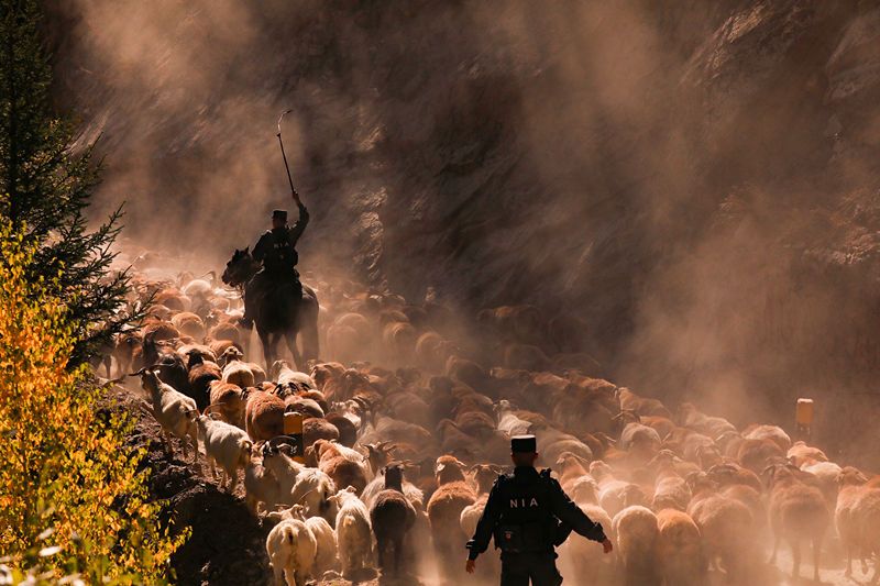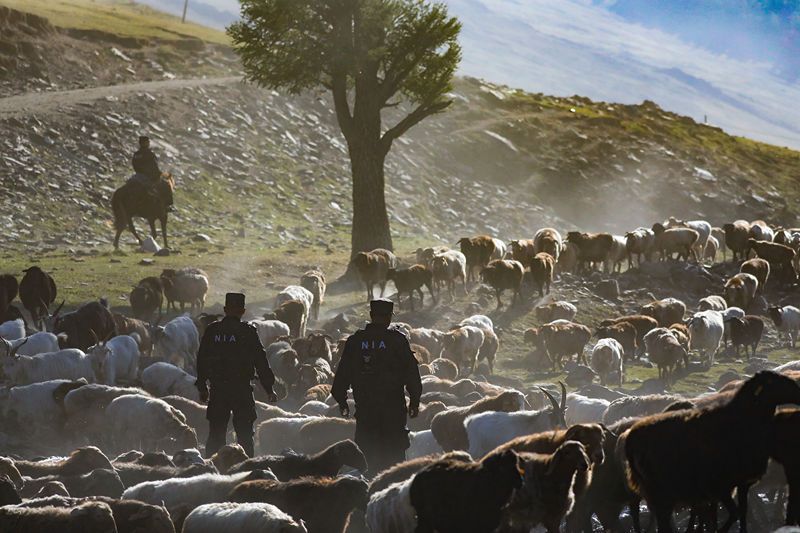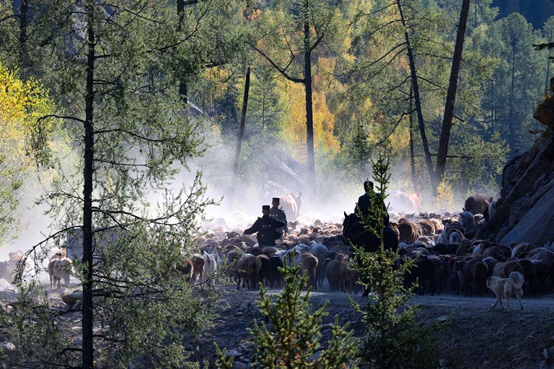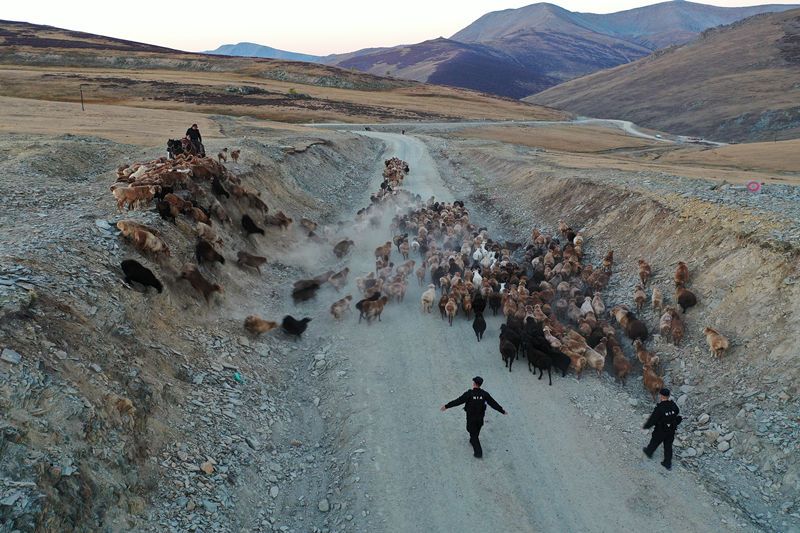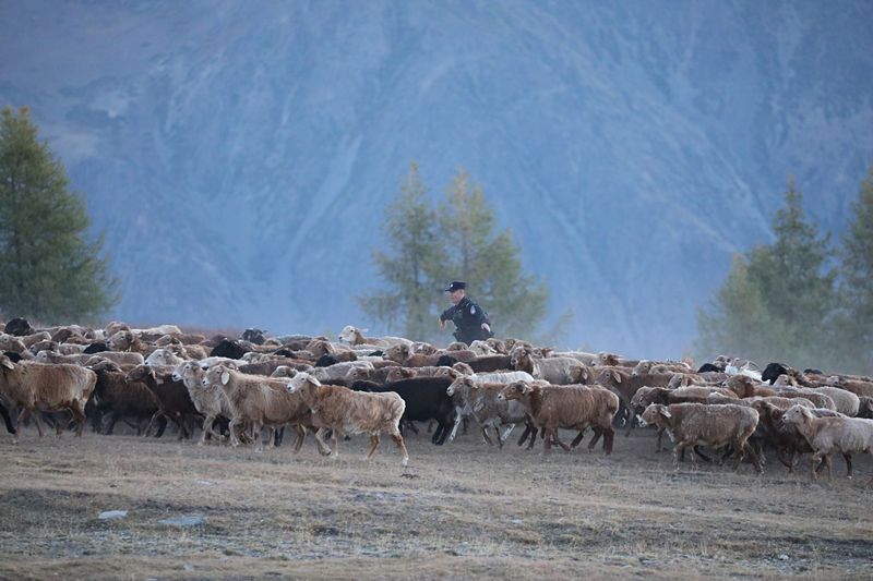 2021年9月8日,新疆阿勒泰,“护牧分队”民警帮助牧民转场。