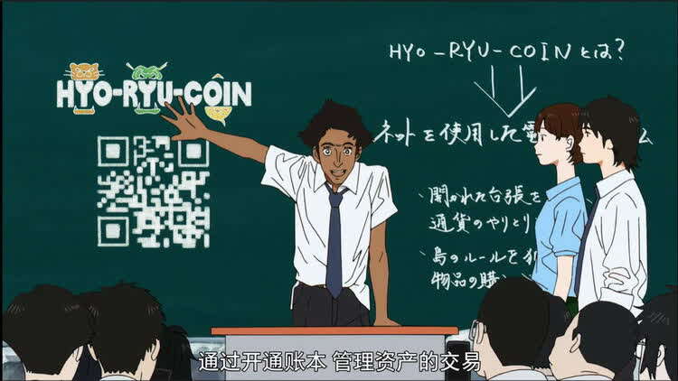 而在这些学生所漂流到的第二个异次元世界里,这里的规则则是“万物有偿”,不能白拿(除非对方送你)。否则,即便到手之物,也会在蓝色火焰里付之一炬。动画里的人物拉吉塔尼为此发明虚拟货币APP,建立金融体系。扫码支付的场面,令人忍俊不禁。