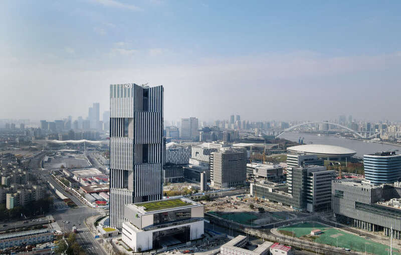 2020年12月17日,新开发银行总部大楼竣工仪式在上海举行。这是12月17日在上海世博园区拍摄的新开发银行总部大楼(无人机照片)。新华社记者 方喆 摄