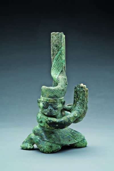 “3号‘祭祀坑’出土的铜顶尊跪坐人像,由上半部分铜尊与下半部分人像组合而成。”冉宏林说,坑内的铜祭坛、神树纹玉琮等器物,题材独特、细节丰富,均前所未见,是古蜀人精神世界的物质体现,为进行相关研究提供了重要素材。