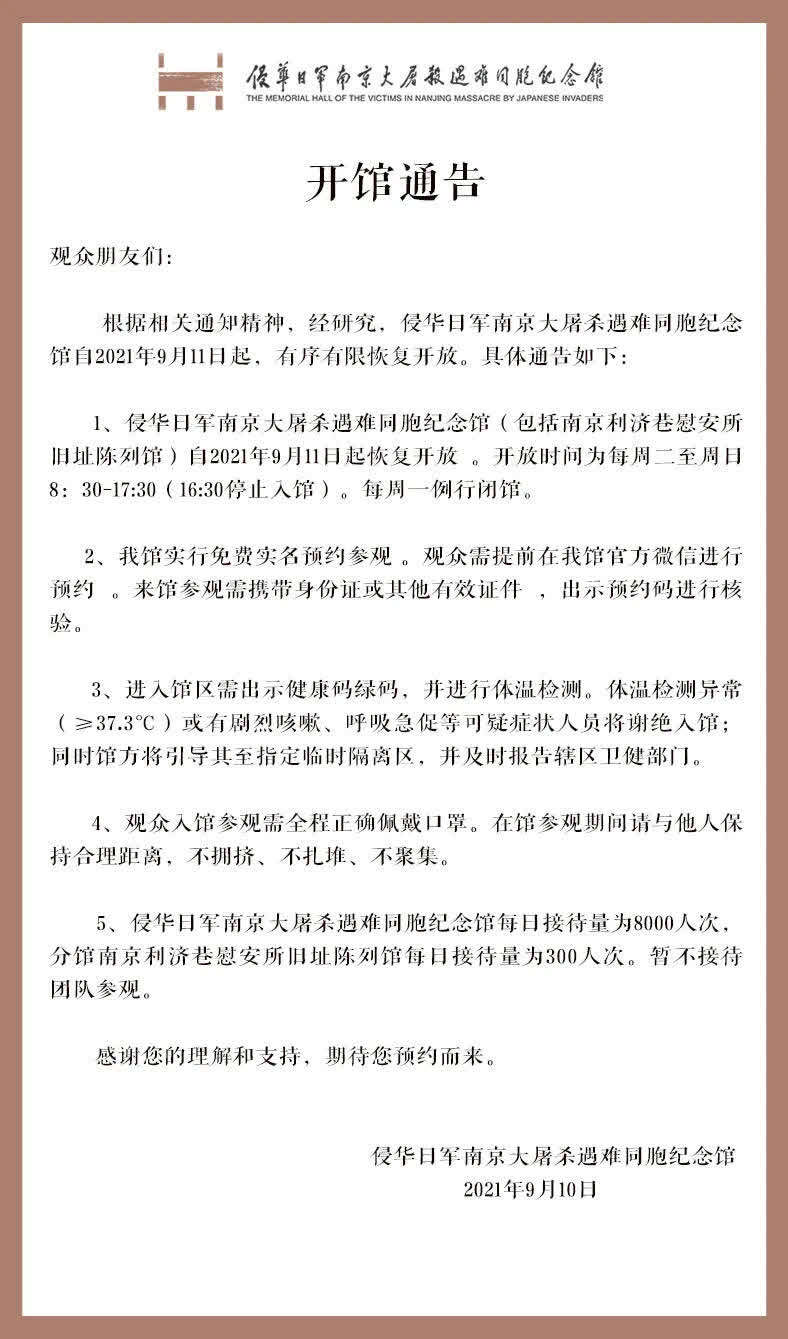 根据相关通知精神,经研究,侵华日军南京大屠杀遇难同胞纪念馆自2021年9月11日起,有序有限恢复开放。具体通告如下: