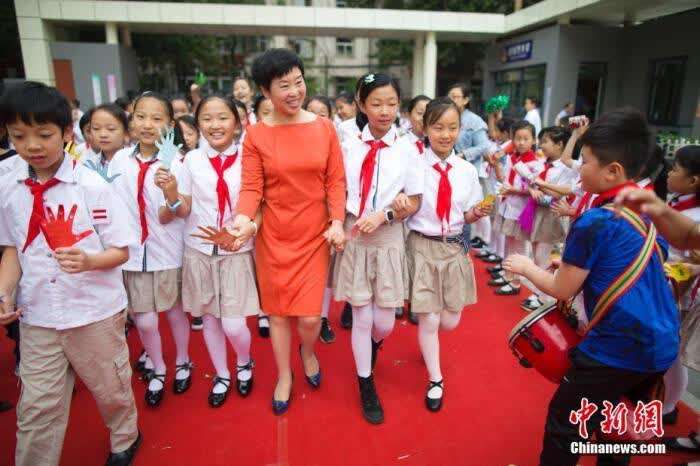 资料图:老师们牵着学生的手走过红地毯步入校园,并接受学生们的敬礼与祝福。 张云 摄