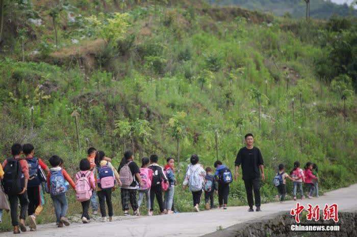 资料图:一名“90后”乡村教师组织学生排队上下学。 中新社记者 瞿宏伦 摄