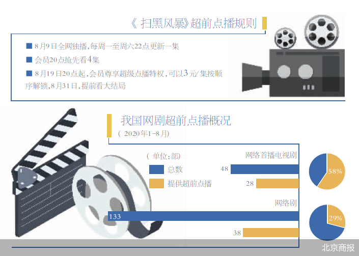 北京商报记者在《扫黑风暴》的“观剧日历”上看到,剧集共28集,8月9日起在腾讯视频独播,每天更新1集,会员可抢先看4集。从8月19日起,会员可按3元每集的价格顺序解锁,每天新解锁1集。