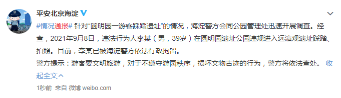 据海淀公安分局官方微博“平安北京海淀”消息, 针对“圆明园一游客踩踏遗址”的情况,海淀警方会同公园管理处迅速开展调查。经查,2021年9月8日,违法行为人李某(男,39岁)在圆明园遗址公园违规进入远瀛观遗址踩踏、拍照。目前,李某已被海淀警方依法行政拘留。