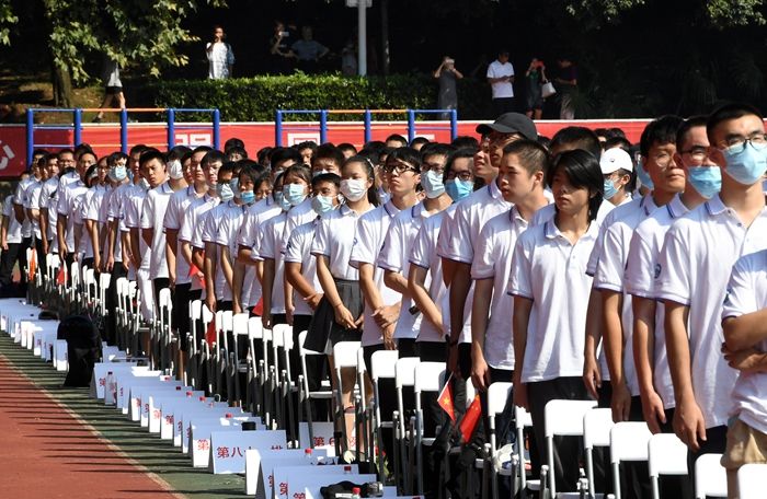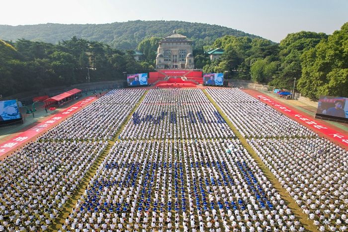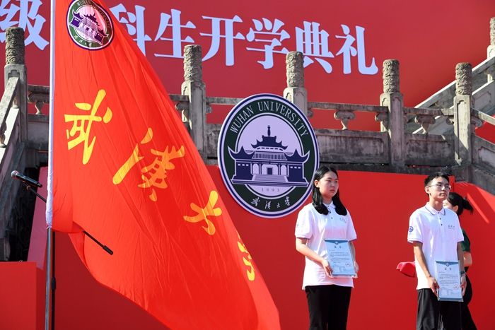 2021年9月12日上午,武汉大学2021级本科生开学典礼在九一二操场举行。现场,7000多名本科新生佩戴武大校徽,合唱武大校歌,开启大学生涯。