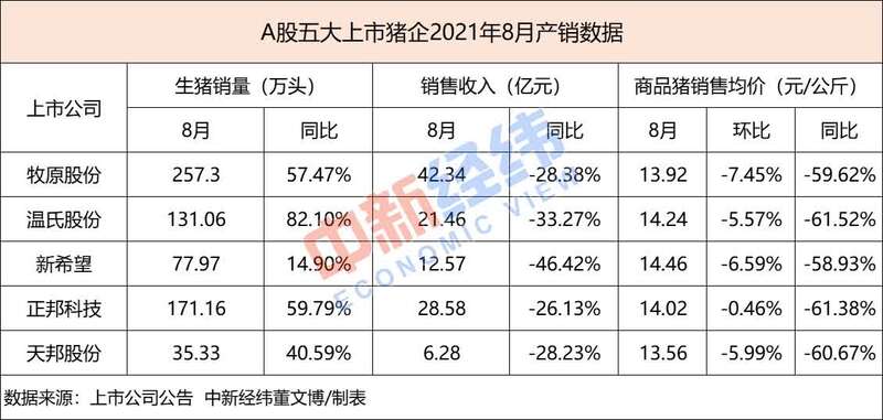 近日,A股五家“养猪大户”牧原股份、温氏股份、新希望、正邦科技、天邦股份公布8月份产销数据显示,月内商品猪销售均价同环比齐跌。