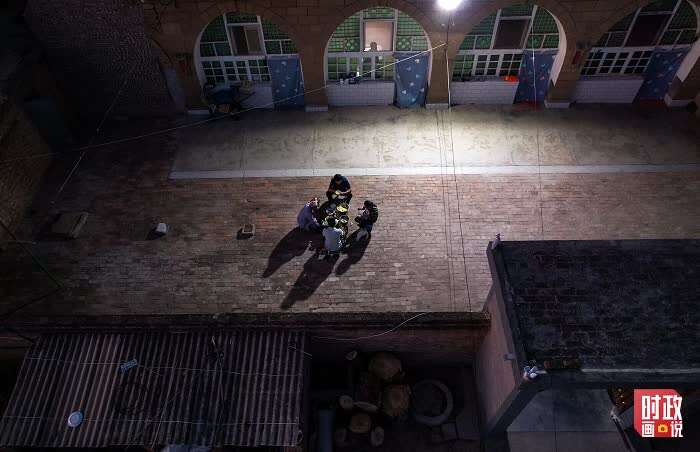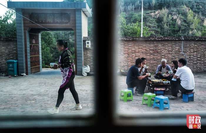 窑洞前的小院里,劳作了一天的农民围坐在饭桌前,享受一天中最恬适的时光。