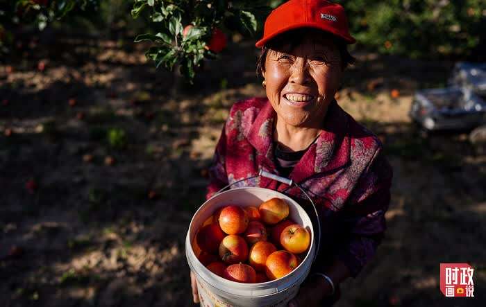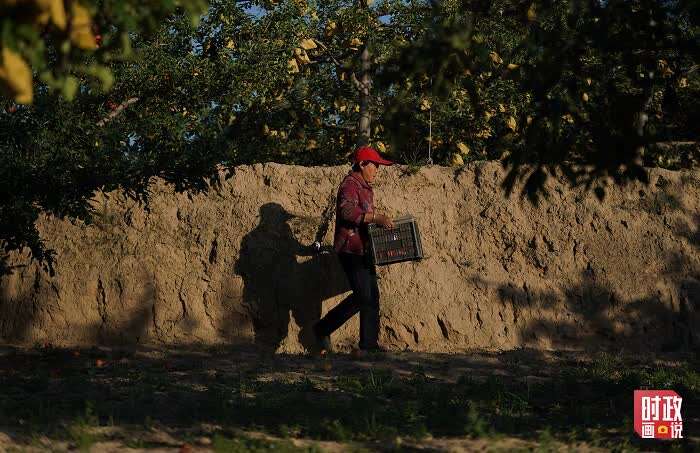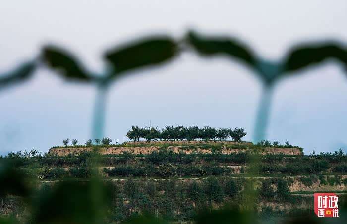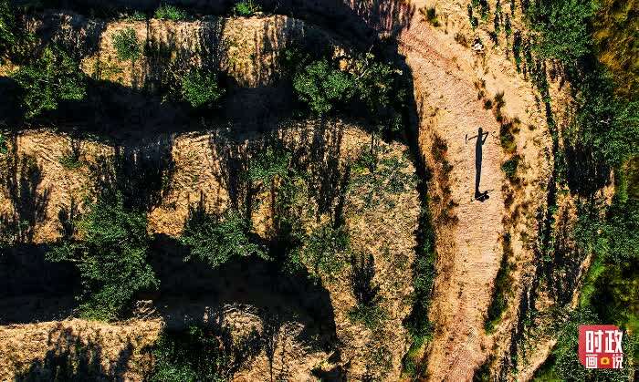 扛着锄头的村民走过高坡梯田,满山的果树有效固化了水土,黄土坡变青山。