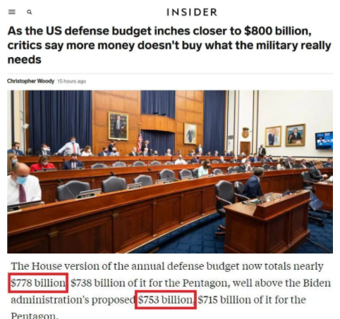 △“商业内幕”网站:众议院版本的2022财年国防预算总额接近7780亿美元,远高于拜登政府提出的数额。