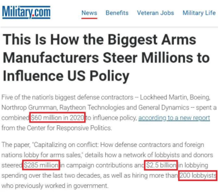 据统计,美国军火商为了游说华盛顿政客,在过去20年总共花费了2.85亿美元的政治捐款和25亿美元的游说支出,并雇佣了200多名以前在政府工作的游说者。仅去年一年,美国五大军工巨头就豪掷了6000万美元的游说资金。