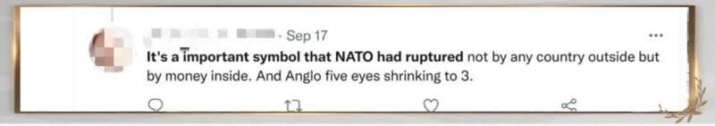 ▲ “北约分裂的重要标志,不是因为任何外面的国家,而是因为(联盟)里面的钱。同时‘五眼联盟’变成了‘三眼’。”