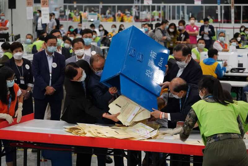 9月19日,香港特区选举管理委员会主席冯骅(右四)在打开票箱。新华社记者 吕小炜 摄