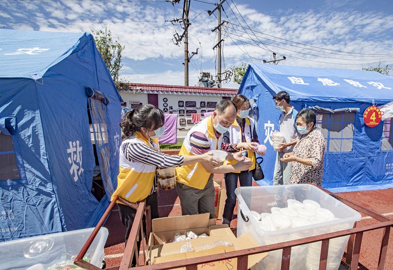 2021年9月19日,四川省泸州市泸县,嘉明镇嘉明小学安置点,志愿者送午餐。