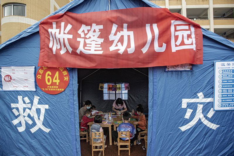 2021年9月19日,四川省泸州市泸县,嘉明镇嘉明小学安置点,学生在帐篷外学习。