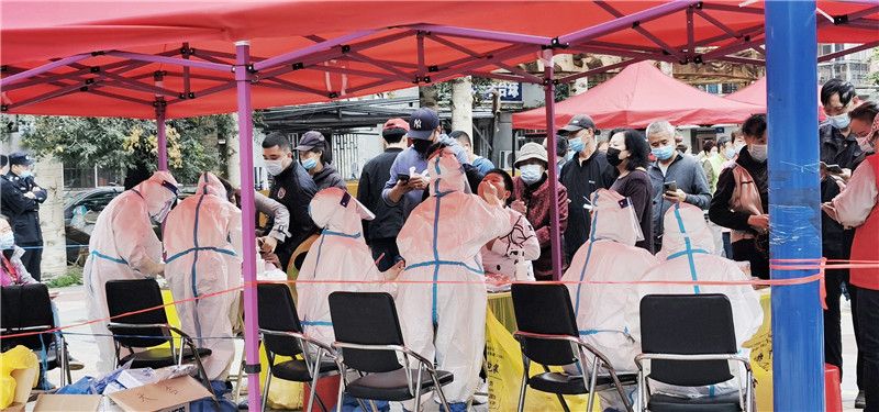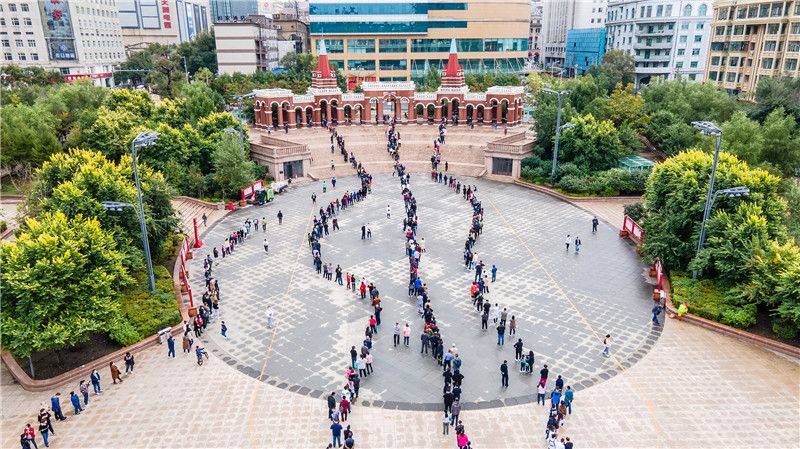 2021年9月22日,黑龙江省哈尔滨市南岗区居民正在青年广场检测点,有序排队进行核酸检测。