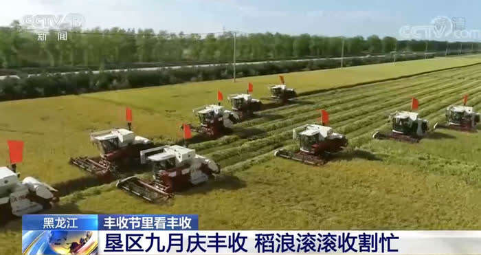 央视网消息:这里是黑龙江垦区前进农场的水稻田,9台农机正在进行割晒作业,每一台农机1小时就可以割晒20亩稻田,9台农机只需要5个多小时即可完成1000亩水田的割晒工作,在加快秋收进度的同时确保粮食颗粒归仓。