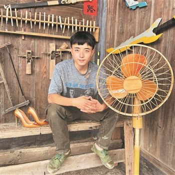 安旭和他制作的木质电风扇、高跟鞋。受访者供图