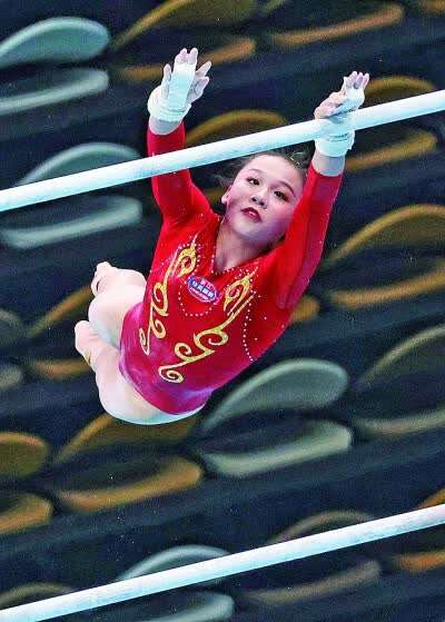 9月24日,全运会选手在体操女子个人全能决赛高低杠项目比赛中。光明日报记者 郭红松摄/光明图片