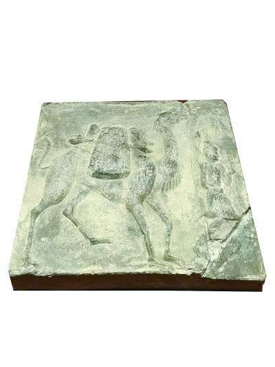 来自西域的胡人商队是活跃在丝绸之路上的主体,胡商的形象在敦煌壁画中屡见不鲜,在出土文物中也有大量反映。比如展柜里有一块唐代的砖,以阳刻的方式表现了一位胡人牵着驮载货物的骆驼。这是古代商队不畏艰险在丝绸之路上长途跋涉的反映,亦是唐代诗人张籍《凉州词》中“无数铃声遥过碛,应驮白练到西安”的图解。