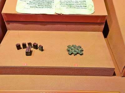 元代的回鹘文木活字(左)和景教十字纹铜牌饰