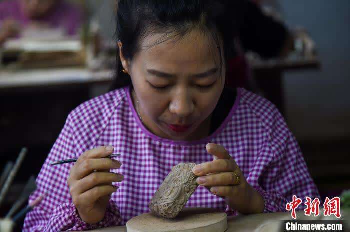 工人正在进行澄泥砚的雕刻。 武俊杰 摄