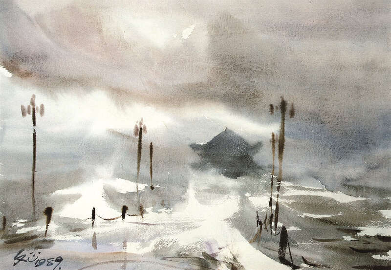 晏文正《风雨栈桥》37cm×50cm 1989年 私人收藏