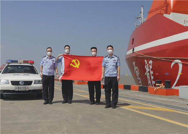 2021年9月27日11时,上海,国产“雪龙2”号科考破冰船圆满完成中国第12次北极科学考察任务顺利返航,靠泊在上海外高桥的中国极地科考国内基地码头。上海边检总站外高桥边检站将入境查验点前置至码头,靠前“一站式”办理船舶和人员入境边检手续,让“雪龙2”号快速回到祖国怀抱。