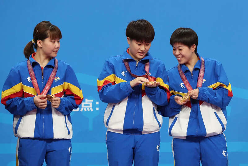 9月21日,陈幸同(左)、李佳燚 (中)、王艺迪在颁奖仪式上。当日,在陕西延安进行的第十四届全运会乒乓球项目女子团体决赛中,辽宁队以3比1战胜山东队,获得冠军。新华社记者张涛摄