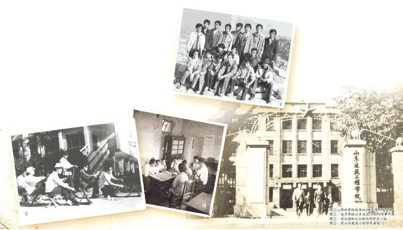 图①:陶世虎给城本814班上美术写生课 图②:伍子昂给山东省设计院的同事评图 图③:周兆驹和8531班的同学在一起 图④:原山东建筑工程学院南校门