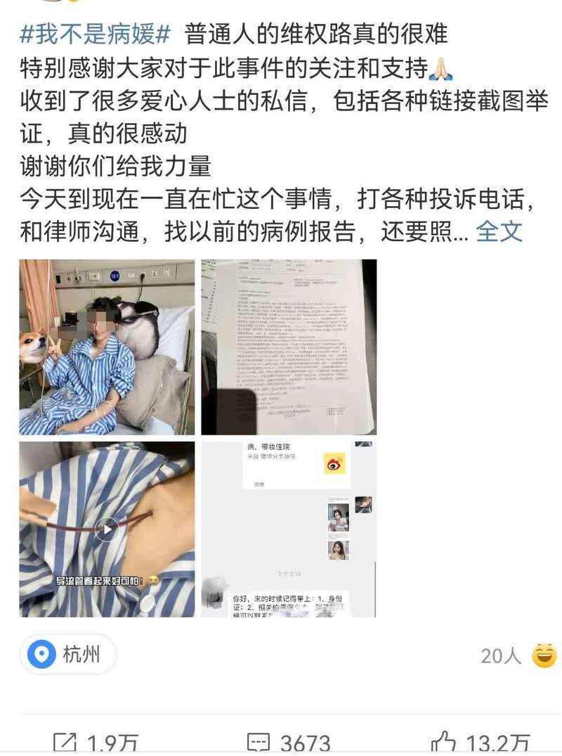 在网络流传的一组“病媛”照片中,有一张是时尚博主张某。她公开表示,自己并非所谓的“病媛”。这张照片其实拍摄于2020年2月28日,当时她在社交平台上发布动态:“坚强的病号”,照片中的她穿着病号服,半躺在病床上,左手输液,右手比着胜利的手势。她在评论区告诉大家:“我没事,就是个甲状腺的小手术啦,过两天出院, 期待!”评论区还有一张她穿病号服吃病号餐的照片。