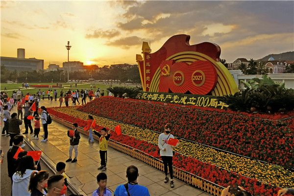2021年10月1日清晨,辽宁省大连市人民广场,众多市民伴随着国庆节第一缕阳光在以“不忘初心、牢记使命”为主题的巨型花坛前留影。