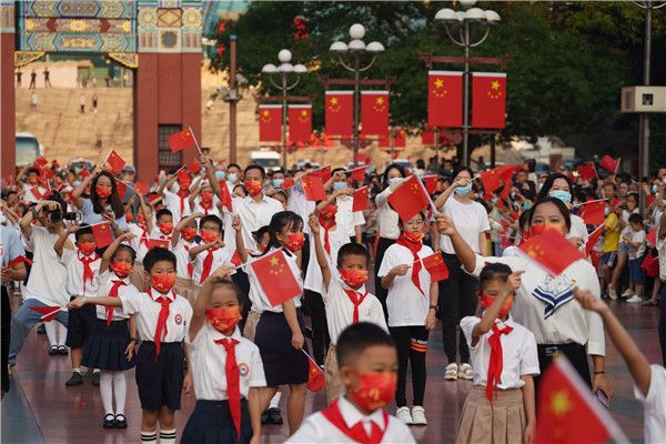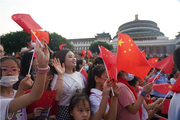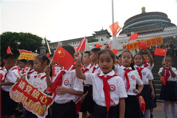 2021年10月1日,重庆市在人民广场举行“永远跟党走 国旗伴成长”重庆青少年迎“国庆”共升国旗爱国主义教育活动。来自两江新区优秀青少年代表、两江新区重光小学、九龙坡区天宝实验学校、江津区综保小学、以及200名重庆优秀青年代表和自发前来的市民一起观礼国庆升国旗仪式,祝福祖国繁荣昌盛。