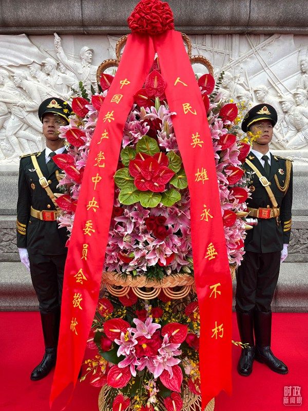 △图片左侧是纪念碑正面的“胜利渡长江”浮雕,对面静静摆放着敬献给人民英雄的花篮。(总台央视记者王志明拍摄)