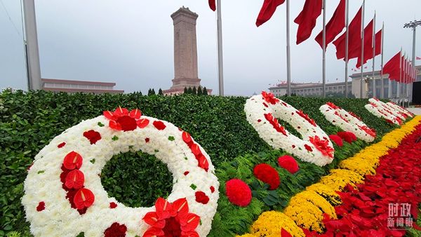△天安门广场中央,“祝福祖国”巨型花篮。(总台央视记者耿小龙拍摄)