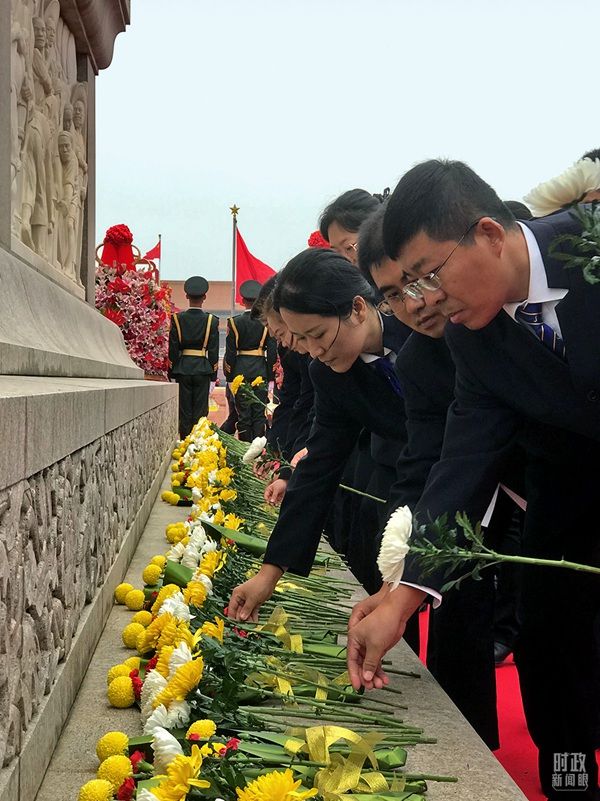 △各界群众代表在纪念碑前献上手中鲜花。(总台央视记者石伟明拍摄)