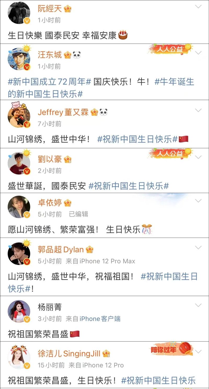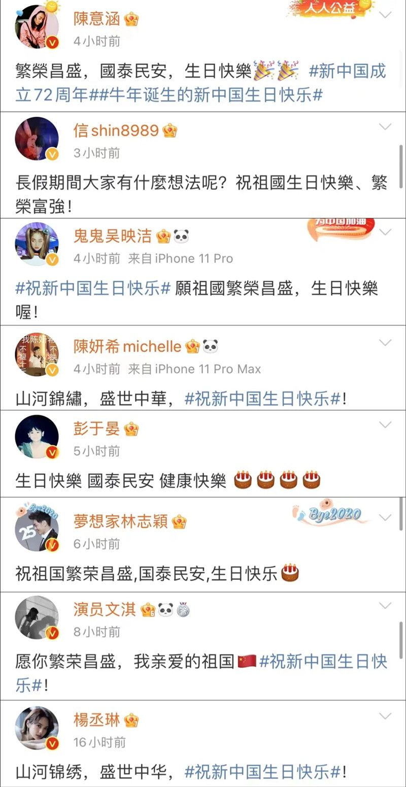 转发“祝新中国生日快乐”相关微博的远不止这几位台湾艺人,欧阳娜娜、王大陆、赖冠霖、陈立农、焦恩俊、林志颖、杨丽菁、徐洁儿、陈志朋、杨丞琳、陈妍希、阿信、彭于晏、阮经天、吴映洁、陈意涵、辰亦儒、汪东城、董又霖、刘以豪、林佑威、卓依婷、文淇等也表达了自己的心声,绿媒怕是快要酸不过来了……