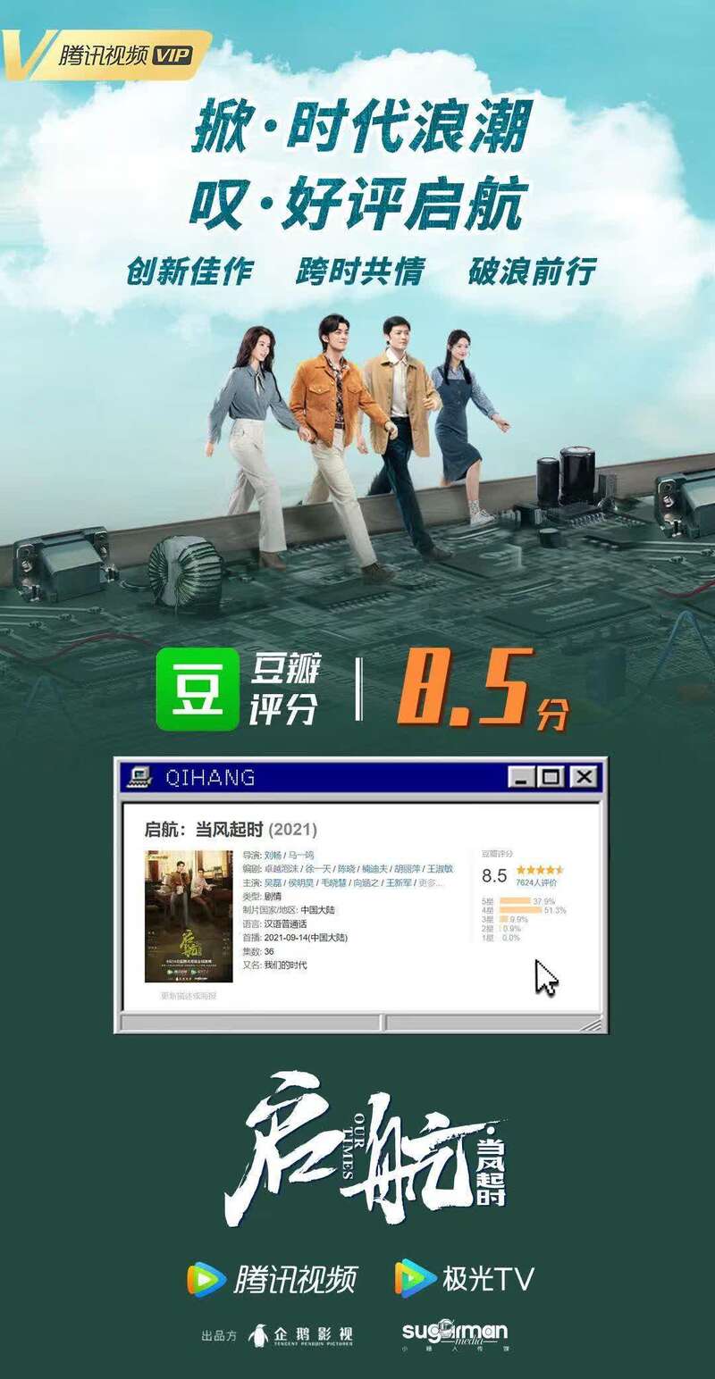 目前,由刘畅、马一鸣执导,卓越泡沫任总编剧,吴磊、侯明昊、毛晓慧、向涵之等主演的电视剧《启航:当风起时》正在热播,豆瓣开分8.5,开分之后评分很快上涨到8.6分。该剧以萧闯和裴庆华两人故事的开始,展现的90年代早期互联网创业者们拼搏奋斗的故事,是一部反映改革开放后,部分科学技术工作者解放思想、锐意进取、直面挑战、战胜挫折,最终事业转型成功的青春励志年代剧。