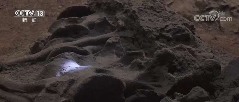 今天,我们的恐龙化石挖掘工作进行到了第二天。最新情况是,我们对恐龙的颈椎部分进行了挖掘,但只发现了三块颈椎化石。我们来看一下,就是这里的三块颈椎。禄丰龙这类恐龙它的颈椎是很长的,现在我们只挖掘出其中的三节。我们通过虚拟模型来直观的感受一下。