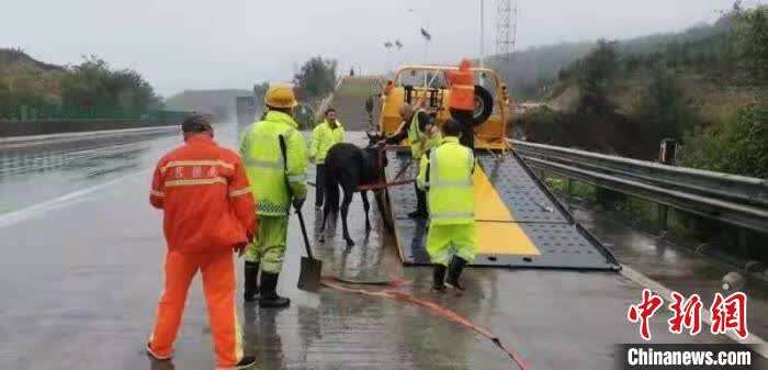 工作人员将马牵上清障车运离高速公路。山西高速交警供图