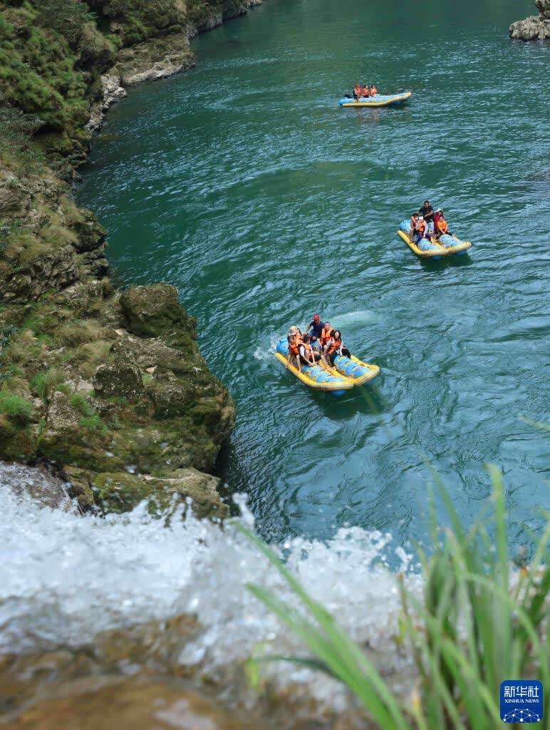 10月3日,游人在湖南省张家界市茅岩河风景区体验水上漂流项目。