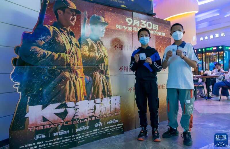 在昆明一家电影院,观众在电影《长津湖》展板前合影(10月1日摄)。