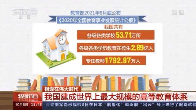 教育部今年8月底公布的《2020年全国教育事业发展统计公报》显示,我国共有各级各类学校53.71万所,各级各类学历教育在校生2.89亿人,专任教师1792.97万人,学前教育毛入园率达到85.2%,九年义务教育巩固率95.2%,高中阶段毛入学率91.2%,高等教育毛入学率54.4%,我国高等教育进入普及化阶段。全国新增劳动力平均受教育年限13.8年,其中,受过高等教育比例达到53.5%。
