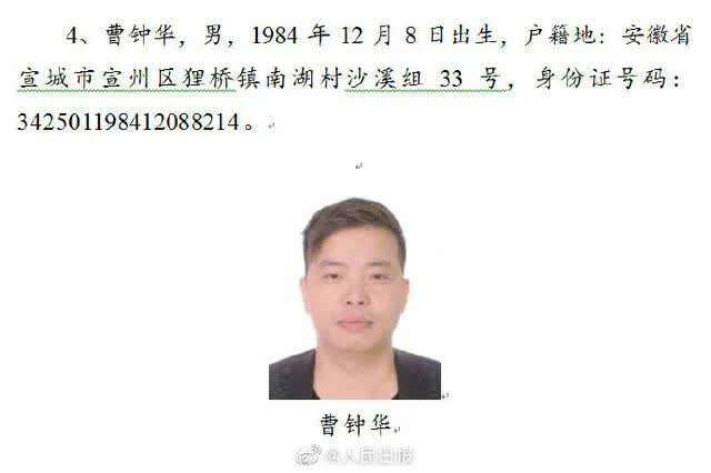 2021年5月13日,公安部发布A级通缉令,公开通缉第六批10名重大文物犯罪在逃人员,其中宣州籍曹钟华在列。宣城警方联合苏州警方经过大量工作联合调查,最终于10月4日,锁定逃犯曹钟华藏身地,并于当日将其抓捕归案。