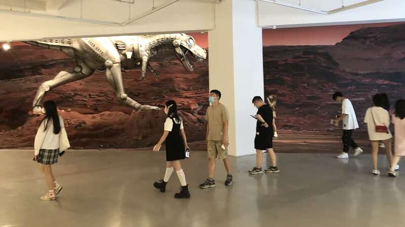 一只身长十几米的“霸王龙”,身体细节全部由金属质感的机械部件构成,正踏破洪荒奔来,让站在它身体下方的市民穆彦惊叹不已,浑然忘记此刻已是晚上8点,外面天色早已黑透:“一场精彩的展览,就是对思维时空的一次拓展。”