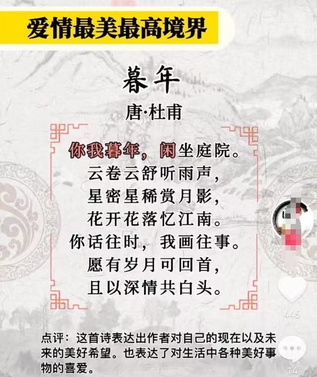 “愿有岁月可回首,且以深情共白头”,这句话眼熟吗?是不是在各大心灵鸡汤公众号上经常看到,最近,这句话又火了,因为它出现在一首名为《暮年》的诗的结尾一句,而在这首诗的作者栏,赫然写着“唐·杜甫”……惊不惊喜?意不意外?