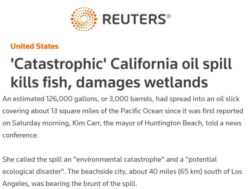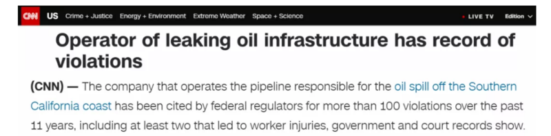 2015年,圣巴巴拉海岸以北一条输油管道破裂,承担事故责任的公司最初估计泄漏量为2.1万加仑,但后来将其修改为超过14万加仑,并且该公司事后承认在发现泄漏三个多小时后才通知联邦监管机构……
