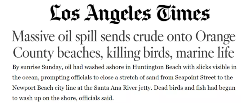 1990年,加州南部海岸发生油轮泄漏事故,41.7万加仑原油流入海中,导致奥兰治县沿岸大量鱼类和约3400只海鸟死亡;